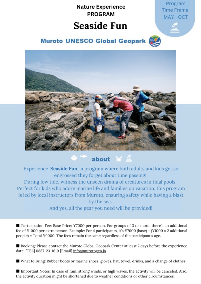 Observe tidal creatures at the coastline in front of the Geopark Center with instructors from the Muroto UNESCO Global Geopark. |